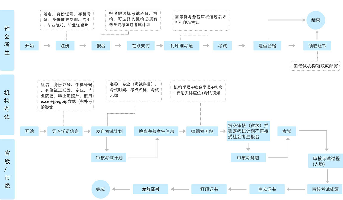 智慧考試系統(tǒng)主要是由考生端、考試端、機構(gòu)端、監(jiān)管端、管理端等組成,對線上考試進行綜合管理的系統(tǒng)平臺。該平臺將考生培訓(xùn)、報名、繳費、考試安排、考務(wù)管理等考試流程信息統(tǒng)一管理,并從各個維度幫助企業(yè)立體化分析考生考試等數(shù)據(jù),極大提升了考試流程的規(guī)范化、標準化、信息化,提升了考試效率,提升了考生的考試體驗。